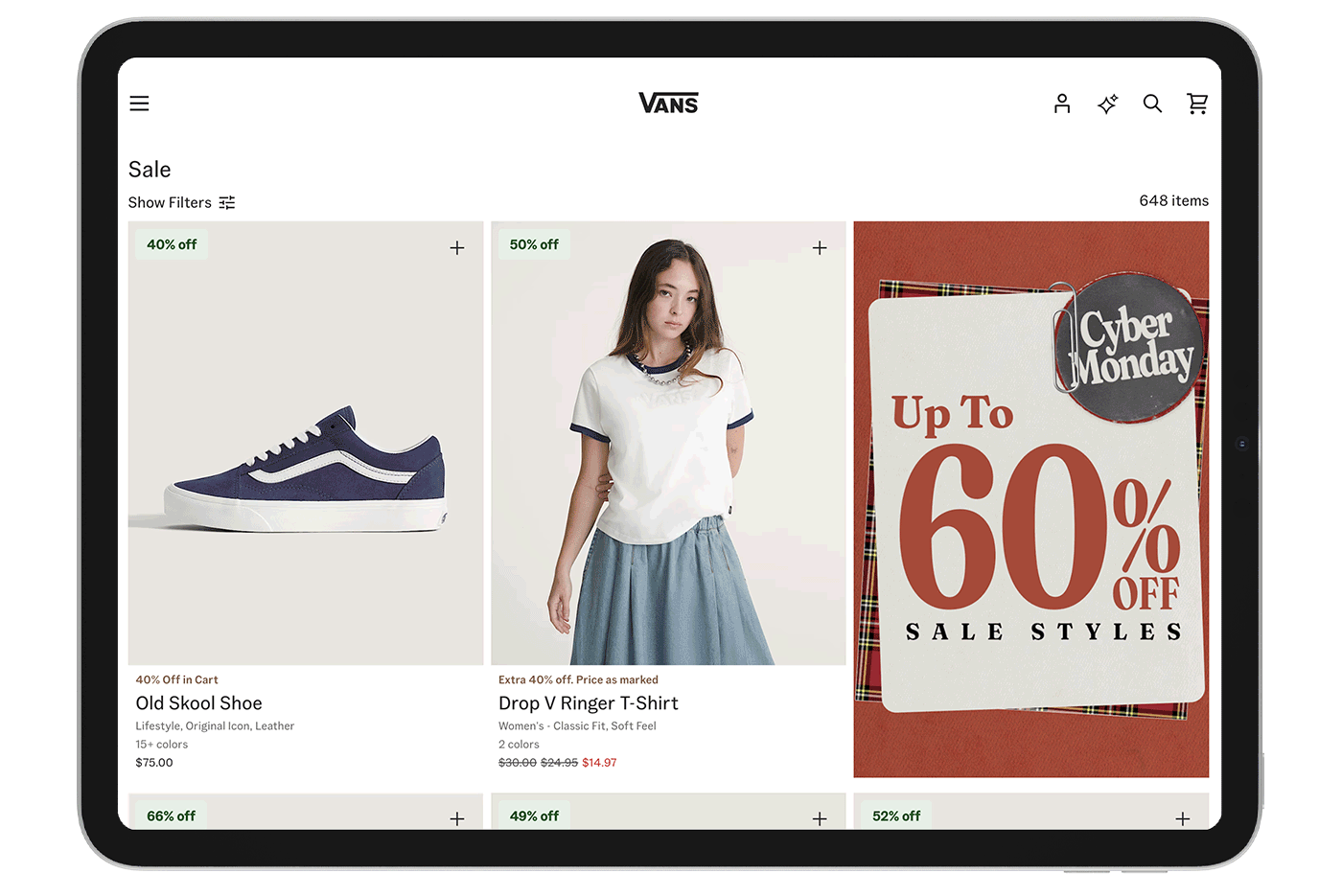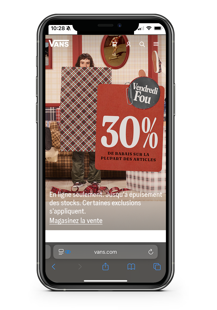 I helped create the look and feel of Black Friday and Cyber Monday using both our global toolkit and considerations of Vans' North American stock, goals, and specific marketing plans for two weeks of sales.I concepted several layout designs for various products and deals and then created the chosen assets alongside deliverables for Canada and contingency promos.